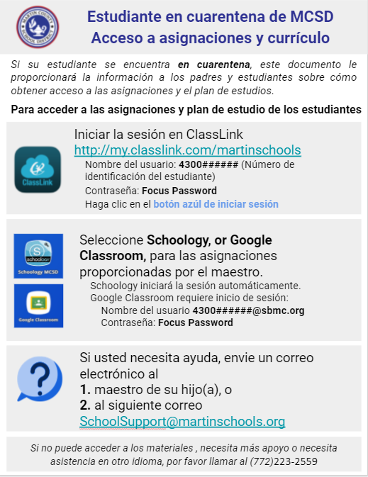 Students who have been directed to quarantine by DOH Martin will access course materials and assignments through the ClassLink portal. Instructional staff will also be available to assist students with lessons and to answer any questions families may have.