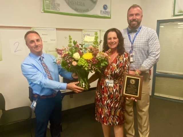 Ms. Robyn Monte (center) accepted flowers and a commemorative plaque from Superintendent John D. Millay (right) and Deputy Superintendent Michael Maine (left) on August 18, 2022. Ms. Monte will retire from MCSD after 34 years in September.