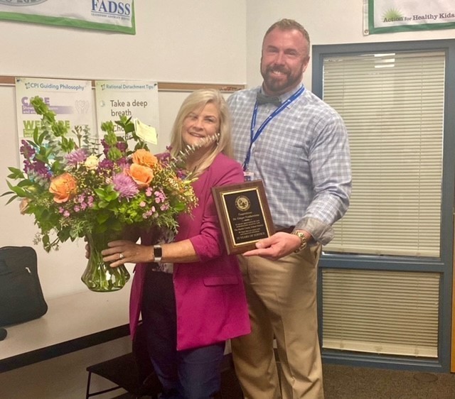 Dr. Ginger Featherstone accepted flowers and a commemorative plaque from Superintendent John D. Millay on Thursday, August 18, 2022. Dr. Featherstone will retire from MCSD after 36 years in September.
