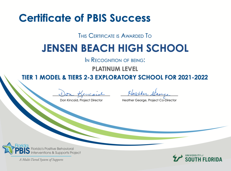 Congratulations to Jensen Beach High School (JBHS) for being recognized by the Florida Positive Behavioral Interventions and Supports project (FLPBIS) and achieving the 2021-2022 Platinum Tiers 1-3 PBIS Model School status!