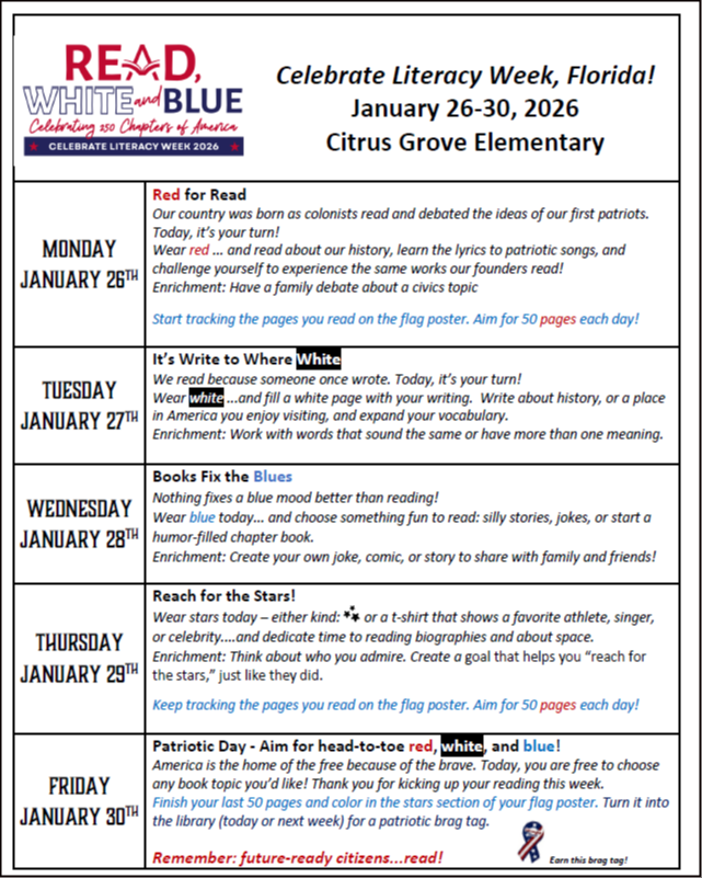 CGE celebrates literacy every January with a special week of themed activities. From January 26th to 30th, we are celebrating our country's 250th anniversary with the dress-up days and events shown below.