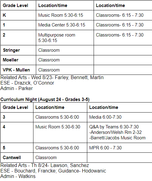 Curriculum Night (August 23 Grades K-2)