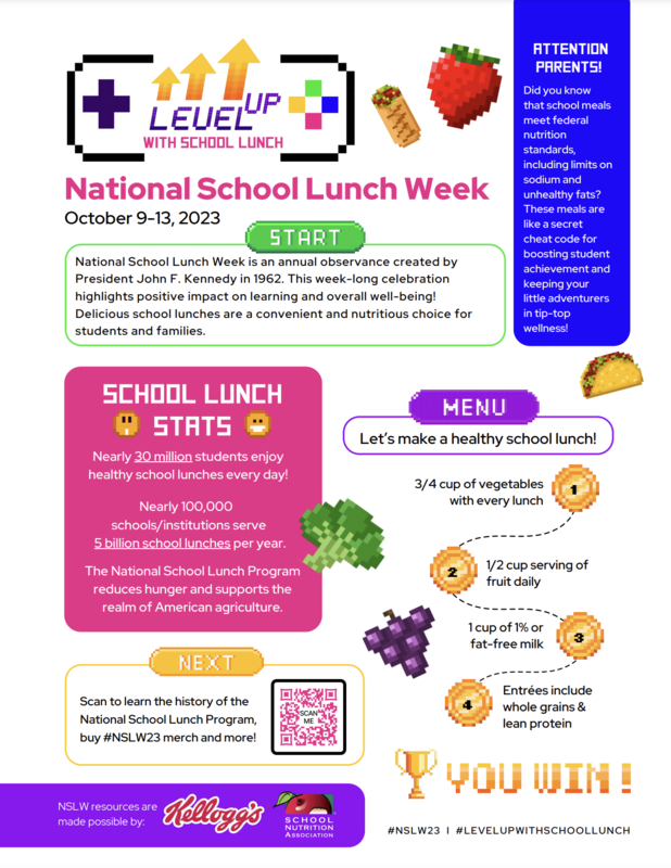 The “Level Up with School Lunch” campaign is made possible by the nonprofit School Nutrition Association and Kellogg’s. Parents and students can follow the fun on social media using the hashtags #NSLW23, #LevelUpWithSchoolLunch and #SchoolLunch.
