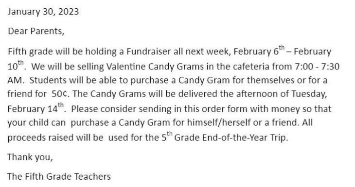 Valentine Candy Grams-Support 5th Grade