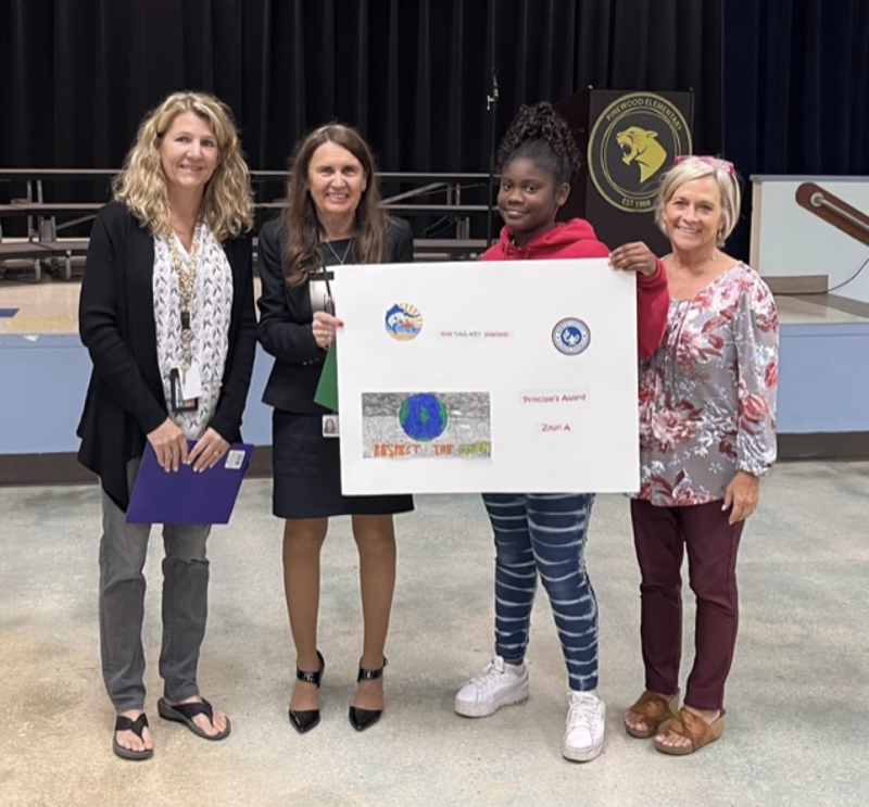 Seawind Elementary: Madelyn Roden (Principal’s Award), Principal Jennifer Michels, Tax Collector Ruth Pietruszewski, Emma Neumann (Award of Distinction), Art Teacher Claudia Gonzalez