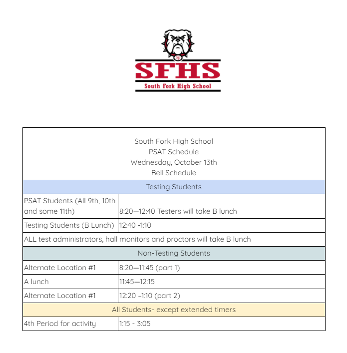 The PSAT & SAT (NCR) is Wednesday, October 13th.