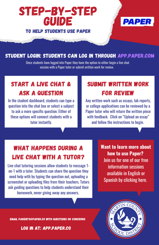The Martin County School District has partnered with Paper Education Company, Inc. to bring an on-demand virtual tutoring platform to students enrolled in grades 6-12. Paper's online tutors will be available 24/7 year-round to assist students with learning and assignments across more than 200 subject areas. These virtual tutoring services will be offered in English, Spanish, French and Mandarin.