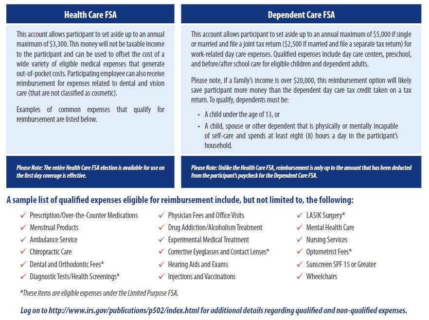 If an employee or family member(s) has predictable health care or work-related day care expenses, the employee may benefit from participating in an FSA. An FSA allows the employee to set aside pre-tax money from their paycheck for reimbursement of health care and day care expenses that they regularly pay. The amount set aside is automatically deducted from the employee’s paycheck and deposited into the FSA. During the year, the employee has access to this account for reimbursement of some expenses that are not covered by insurance. Participation in an FSA allows for substantial tax savings and an increase in spending power. Participating employees must re-elect the dollar amount they wish to have deducted each plan year. Please note: All contributions are deducted on a per paycheck basis.