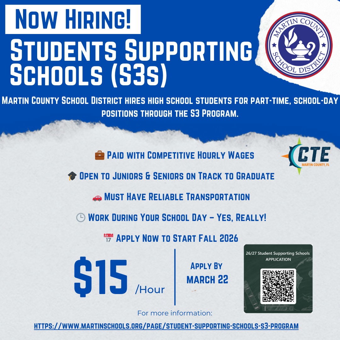 Students Supporting Schools (S3) is a paid internship program where high school juniors and seniors work part-time in Martin County School District departments and schools. Students can earn money, gain real-world experience, and build skills that will help in any career — all while supporting their school community. S3s help to fill important roles in our schools while giving students a valuable head start in the workforce.
